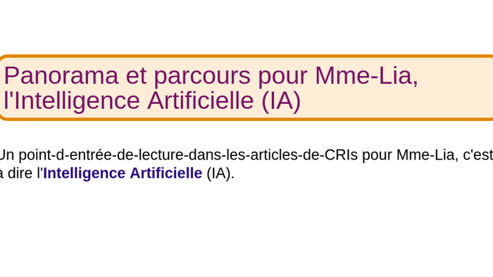 Vision panoramique du domaine de l'Intelligence Artificielle, parcours dans les articles de CRIs,... l'IA... Mme-Lia, ... Pour mieux faire sa connaissance. Et la connaître au delà du blabla dans les média...